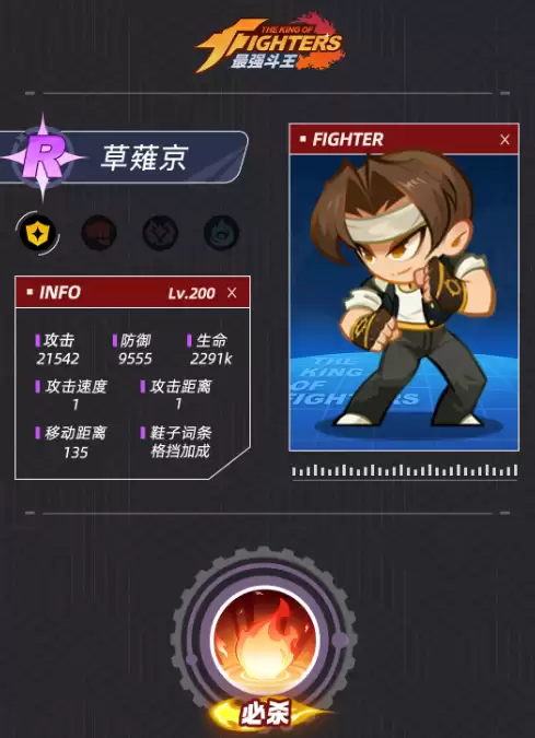 另一位能与东丈组成经典队伍的,是人气角色草薙京。他的特点在于攻击力极为突出,但生存能力相对薄弱。随着等级提升,草薙京的物理伤害会大幅增强,并且有机会打出小范围的群体伤害。同时,他的生命值和格挡率也会得到提升,从而更好地在战场上站稳脚跟,为队伍提供持续的火力支援。当然,阵容搭配并非一成不变。如果你手头有其他更趁手的强力角色,完全可以根据实际情况,与东丈灵活组队,打造出属于你自己的强力阵容。