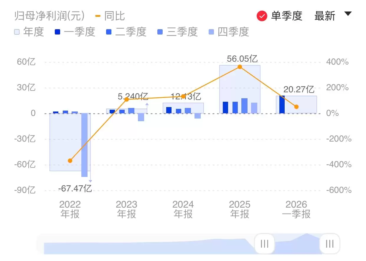 如果我们将视线拉近,环比数据或许更能说明其增长势头。要知道,公司在2025年第四季度的净利润为12.48亿元。以此计算,今年第一季度的净利润环比增长高达62.42%。这个数字,无疑为市场注入了一剂强心针。