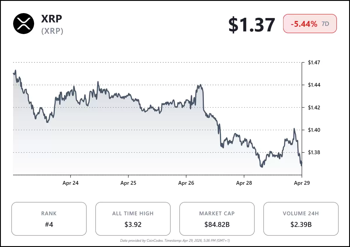 CoinCodex的数据为当前局面提供了注脚:XRP现报1.37美元,过去一周跌幅为5.44%。