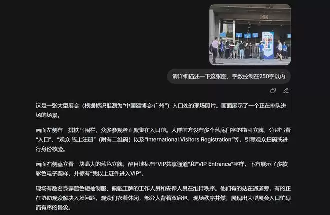 除了画面描述、文字信息读取,这次它还果断判断这是属于中国建博会·广州的活动现场图片。只能说,图片理解这块确实没毛病。