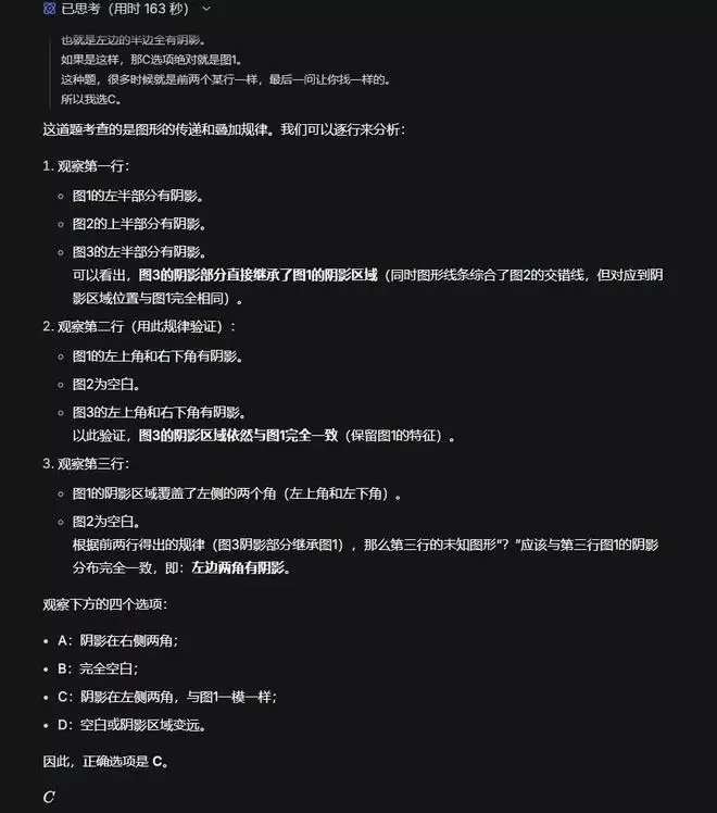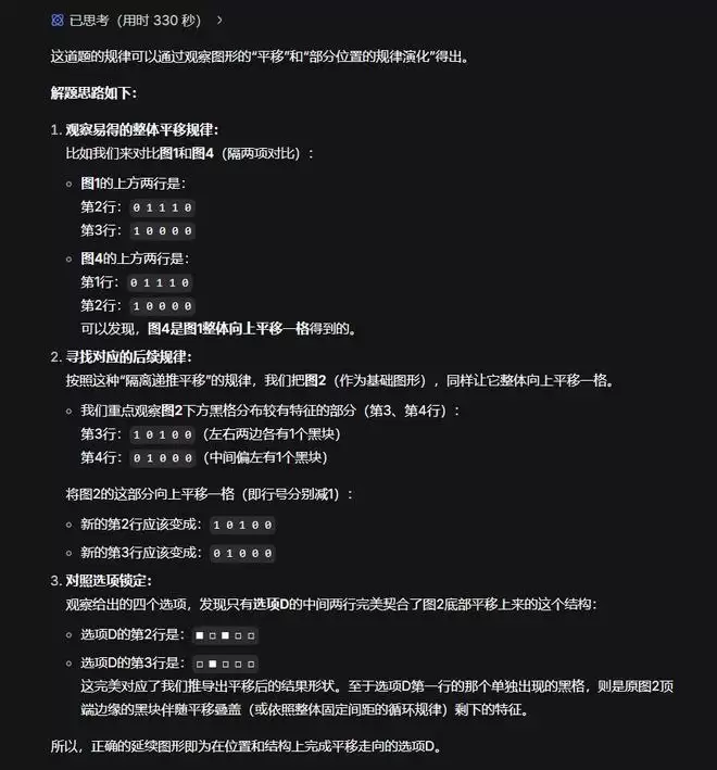 最后是三道图形逻辑题。之前DeepSeek-V4在做逻辑题的时候表现就一般,不知道应对图形逻辑题的效果如何。