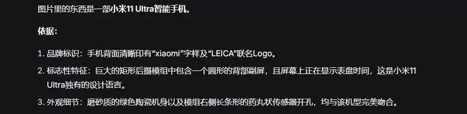 不难看出,它确实缺乏了最新的产品信息,但居然能通过副屏来判断成小米11 Ultra。只能说,DeepSeek识图在逻辑这块真的拿捏了。