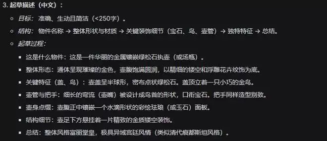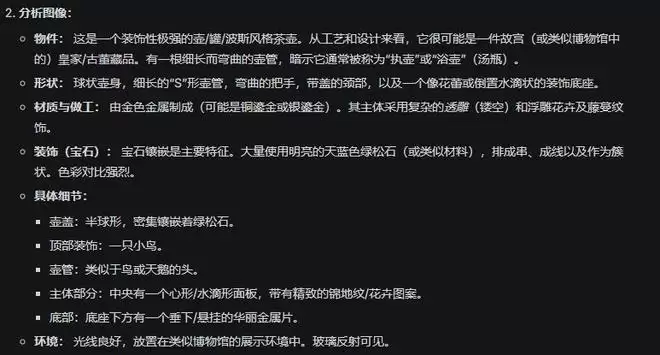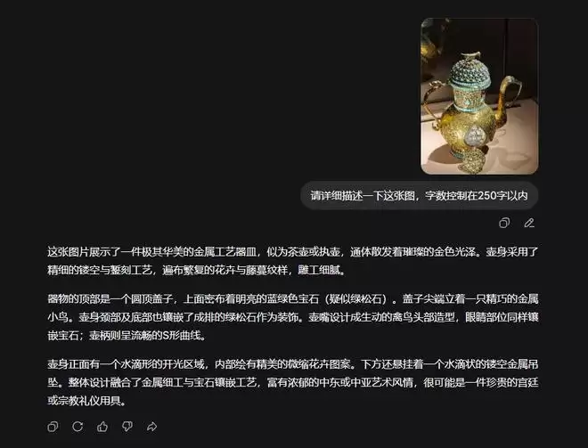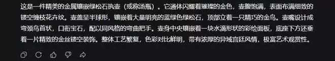 不打开思考模式的情况下,这次回答就是很单纯的画面描述,没有对于物品的解析,但是描述本身还是挺到位的。最后还能看出来这款物品富有浓郁的中东或中亚艺术风情,很可能是一件珍贵的宫廷或宗教礼仪用具。