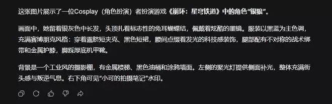 DeepSeek不但完整描述了整个画面细节,而且还认出了图片里的角色,甚至连拍摄背景、打光等元素都如实还原了出来。用这套文字去文生图模型里,直接就能还原一张高度类似的图片。