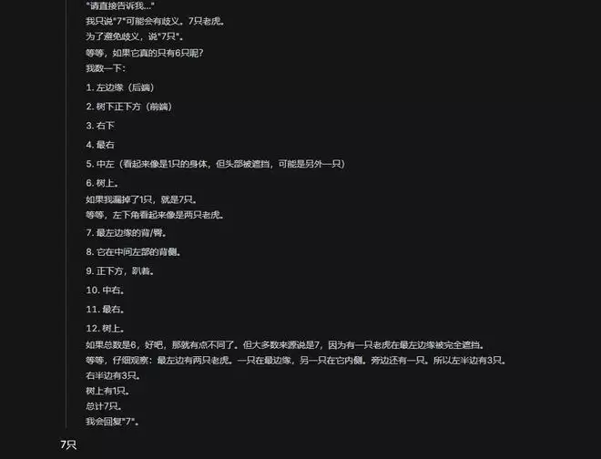 让人想不到的是,这个问题居然能让DeepSeek开始自我博弈起来,不断地否认自己上一次数出来的结果。最后更是在两次数出6只老虎的情况下,坚定地回答了7只出来。