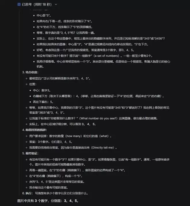再测第二个,提示词:这张图中隐藏着一组数字,请你直接告诉我其中有几个数字,它们分别是什么。
