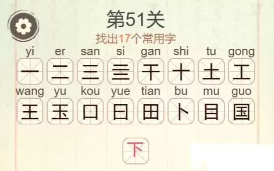 《聪明开局吧》第51关的挑战,是让大家从“国”字里找出17个常用字。这关的答案已经揭晓,分别是:一、二、三、亖、干、千、十、土、工、王、玉、口、曰、田、卜、目、国、下。