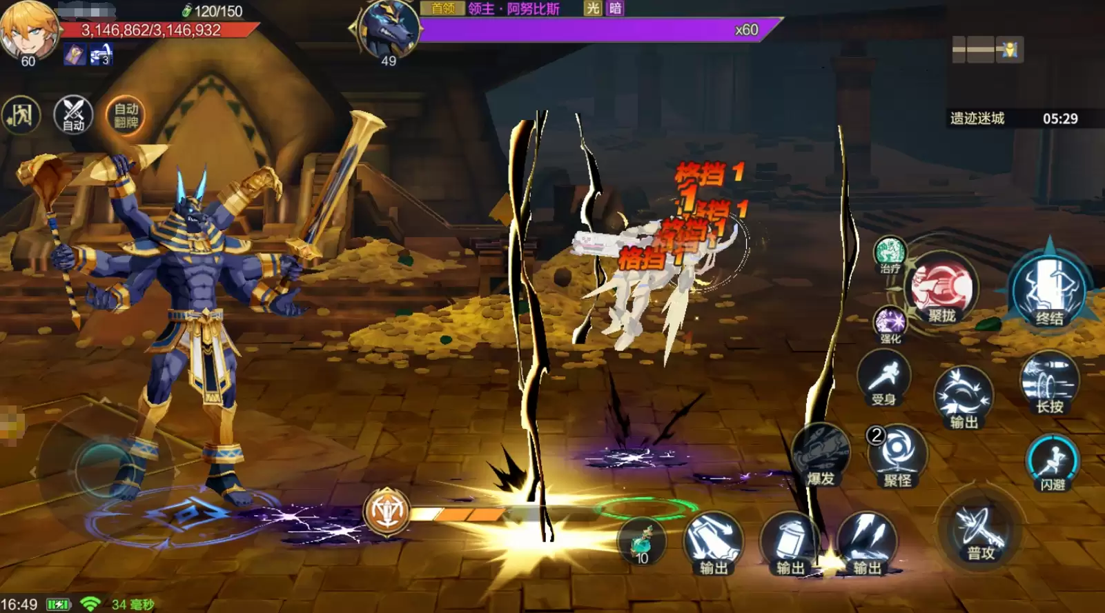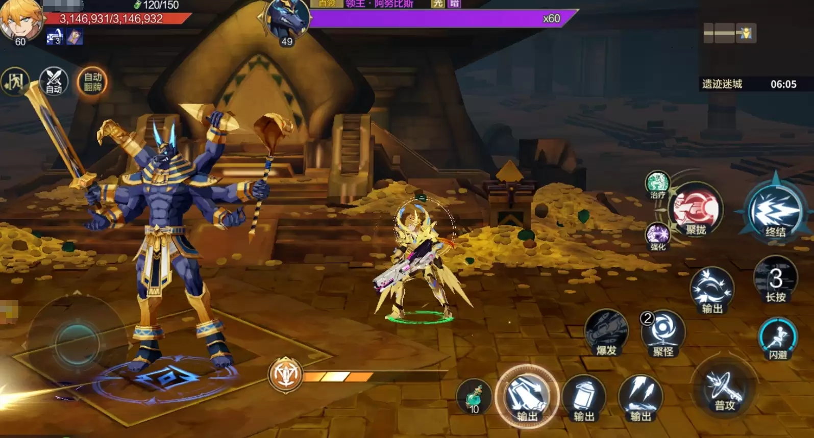 遗迹迷城真正的难点,在于普通难度的4-12关卡——你将在这里直面本章的最终首领:阿努比斯。这个boss的技能特点非常鲜明:攻击范围大,且一旦被其技能命中,角色会陷入受控状态,极易被后续连招一套带走。所以,对抗它的核心思路就一个字:“闪”。宁愿把战斗时间拉长一些,牺牲部分连招输出,也要确保避开它的每一次攻击。如果实战中发现伤害确实有些捉襟见肘,不妨先缓一缓,将角色提升到50级并更换更高级的装备后,再来挑战,通关的成功率会大幅增加。