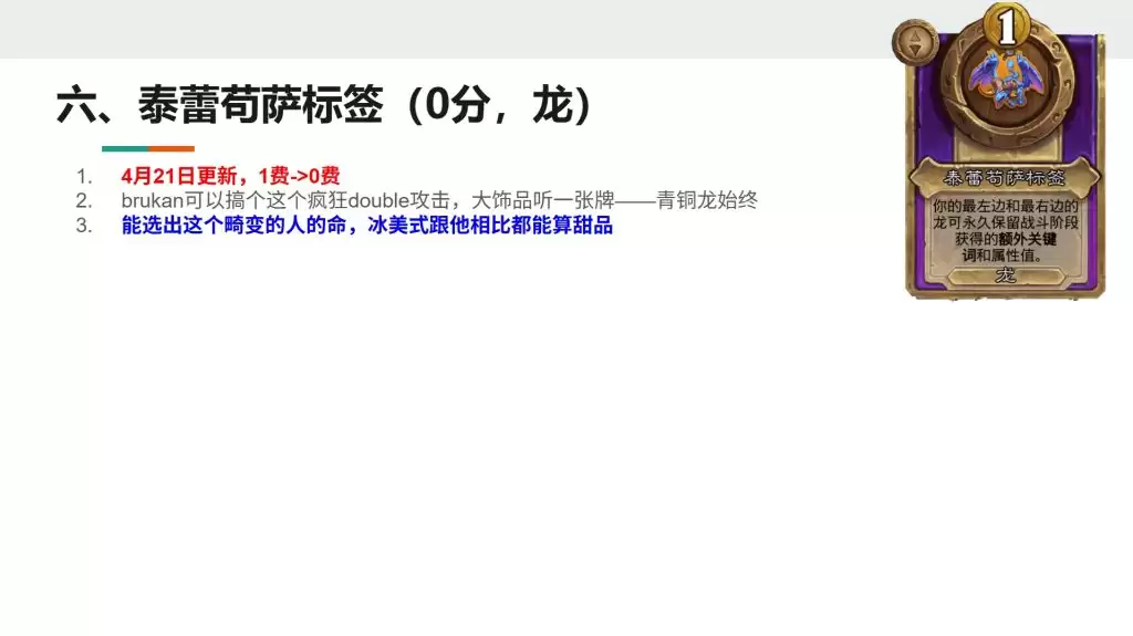 其次是需要关键五本、六本战吼来“质变”的阵容。 比如,玩巨龙流急需“红衣纳迪娜”来提供圣盾,玩野兽流在找“熊妈妈”或者“鸟类的伙伴”。泰蕾苟萨标签提供了一条更平滑的“上本找核心”的路径。你可以在四本时利用战吼随从,提前发现高本的关键牌,为升本后的转型做好无缝衔接。