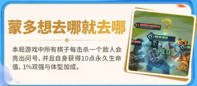 蒙多的效果是全局生效的成长型机制。场上的任何棋子,每击杀一个敌人,都会亮起一个问号特效,同时为该棋子永久增加10点生命值、1%的双抗以及体型。这意味着,雪球会越滚越大,棋子会越打越强。这种机制在前中期如果能够建立连胜优势,到了后期会变得非常夸张。所以,开局阶段尽量稳住连胜,复利带来的增益效果会越来越明显。