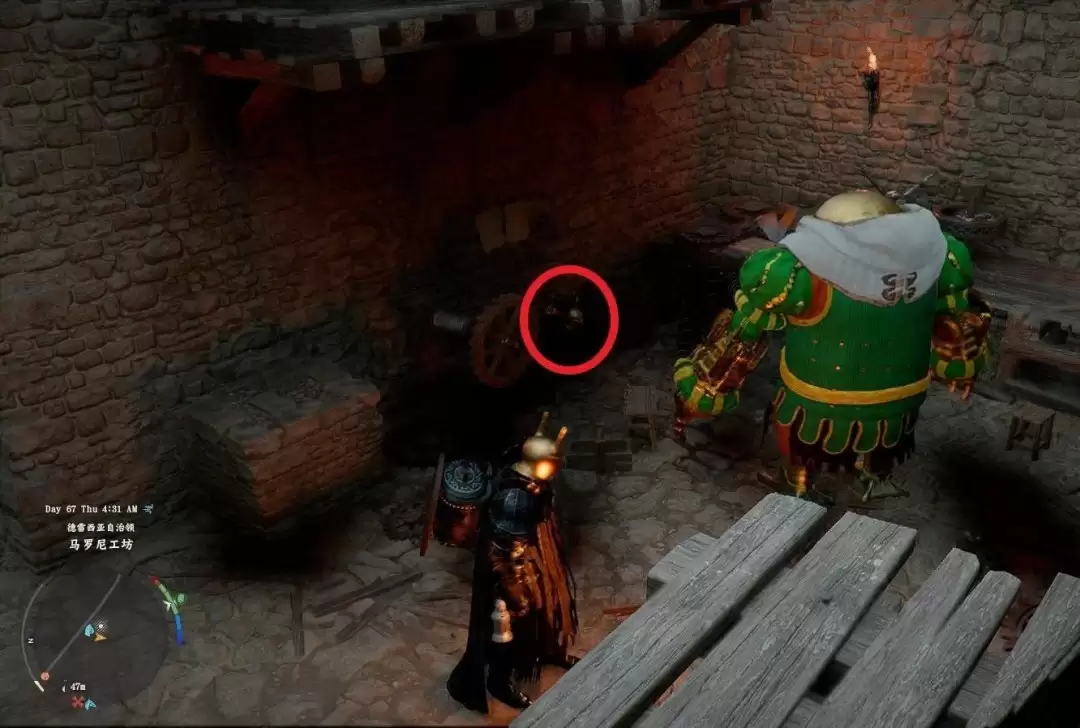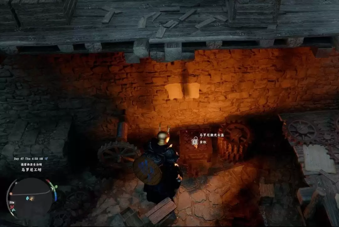 马罗尼激光头盔的确切坐标,位于游戏内德雷西亚区域的右下角,即标注的【马罗尼工坊】内。具体的寻找路径非常清晰:从工坊的正门入口进入后,立即向左转,视野前方的墙壁上会有一个明显的破损洞口。穿过这个墙洞,即可抵达第一个房间。你会发现,头盔正放置在房间内一个大型齿轮旁边的木箱之上。