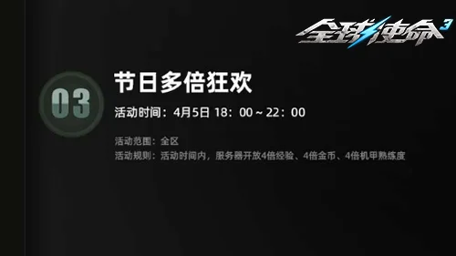 如何让战斗激情彻底释放?答案就在“清明节多倍夜”。这项福利定于4月5日18:00至22:00开启,全区全服、零门槛参与。活动期间,服务器将开放高达4倍的经验、金币以及机甲熟练度加成。这意味着,无论你参与哪种战斗模式,收益都将直接翻两番。对于新手玩家,这是快速跟上大部队的黄金窗口;对于老玩家而言,则是冲击等级与资源储备巅峰的绝佳契机。这场持续四小时的多倍狂欢,足以让每位参与者的实力 visible 增长。