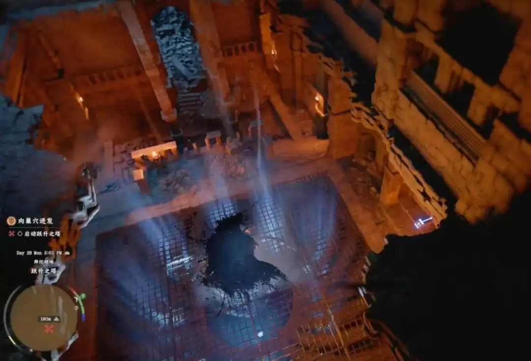 进入塔底后,你会立即看到中央有一个强大的上升气流。无需犹豫,直接跳入并使用滑翔功能,即可借助风力轻松、快速地到达上层平台,极大节省攀爬时间。