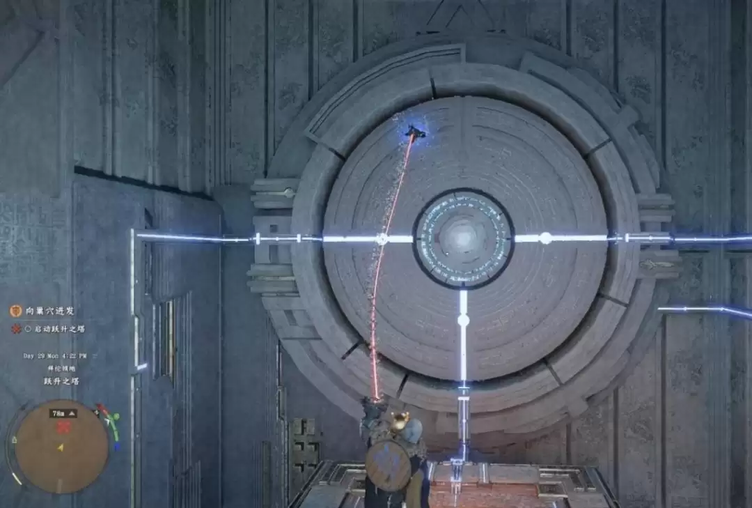 抵达顶部后,你会遇到一个移动的平台。这里有一个实用技巧:先操控角色滑翔至平台的侧面,再安全地跳跃上去。站稳后转身,就能在墙上发现一个熟悉的圆盘型机关。