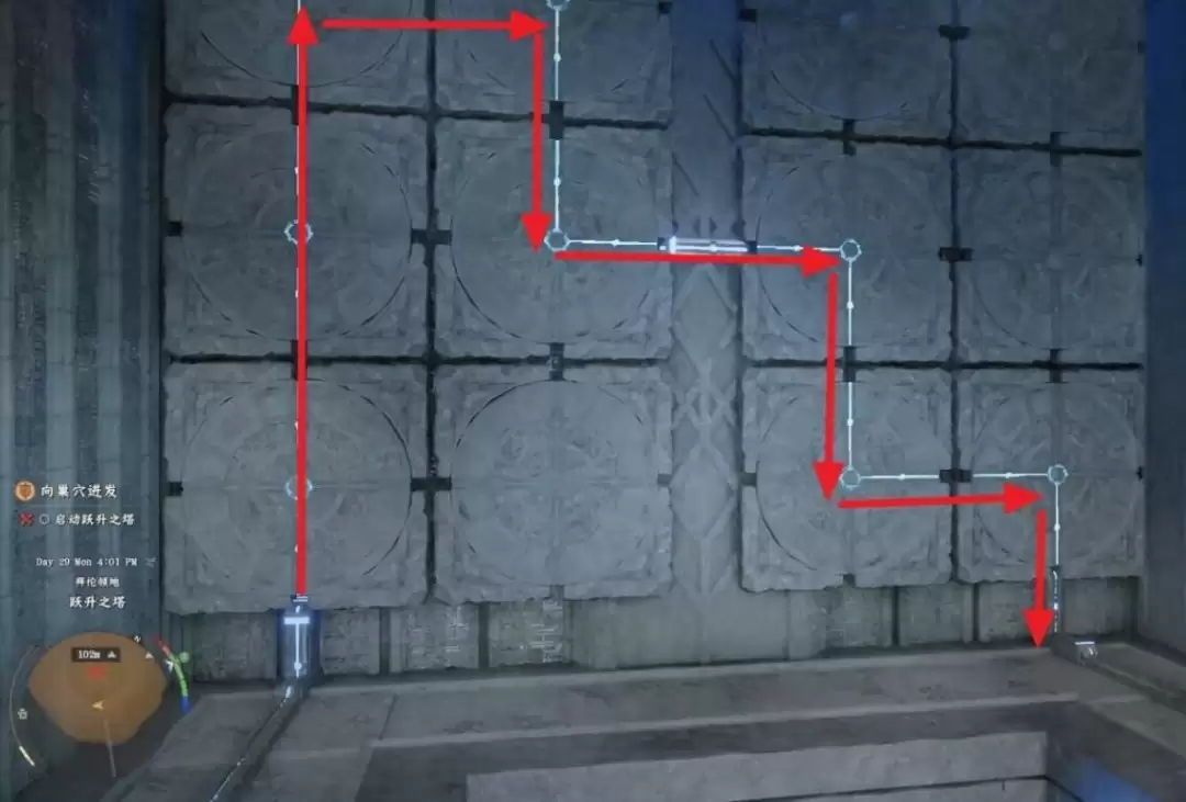 解谜的核心在于构建通畅的能量路径。请参照下图中标红的连接路线来调整圆盘上的节点。当能量成功被激活并沿着路径顺畅流通后,前方阻挡道路的机关板块便会自动升起,为你打开通路。