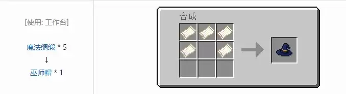 从上图可以看到,合成巫师帽需要三块羊毛和两块线,按照特定的U型结构在工作台上摆放。这里有个小细节值得注意:羊毛颜色的选择有时会影响后续的附魔或染色流程,虽然对基础属性没影响,但追求仪式感或特定风格的玩家可以多留意一下。