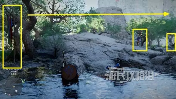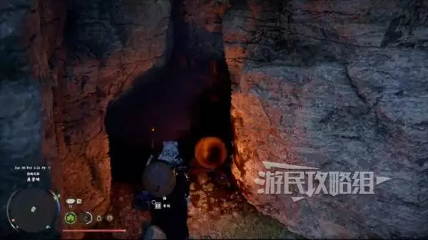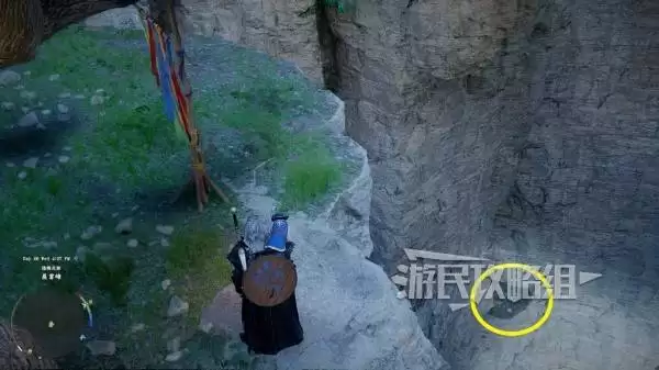 沿着彩带指引走到悬崖尽头,在最后一处彩带标记点驻足。此时请向悬崖的左下方仔细观察,你会看到一个颜色略深的岩石平台。使用滑翔翼或跳跃技能即可安全抵达。