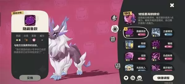 后续策略则需要根据实时战况灵活调整:若“隐藏条款”被交换到了对手手中,你必须立即换上那只仅具备“防御”能力的精灵(建议选择生命值高、防御种族值优秀的肉盾型精灵,以防在交换回合被其他伤害波及而倒下),来承接这次技能交换。