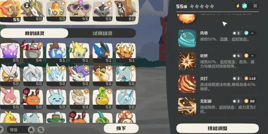 风墙是关键的翼系变化技能,使用后能提供高达50%的伤害减免,并附加迅捷状态,能有效化解对手的先手压制。听桥则是核心的武系防御技能,其减伤效果极为显著,可达80%,并且在成功防御后会立即触发一次反击,反击威力等同于对方所使用技能的威力,是扭转战局、后发制人的战略手段。