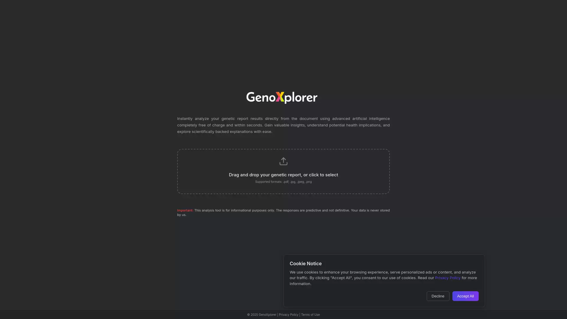 简单来说,GenoXplorer(基因探险家)就是一个为你秒读基因报告的AI助手。你手里那份充满专业符号和数据的报告,上传到这个平台,它就能立刻为你“翻译”出关键的健康提示和科学依据。最吸引人的一点是什么?整个过程完全免费。无论是PDF,还是常见的JPG、JPEG或PNG图片格式,它都能识别处理,极大地降低了使用门槛。