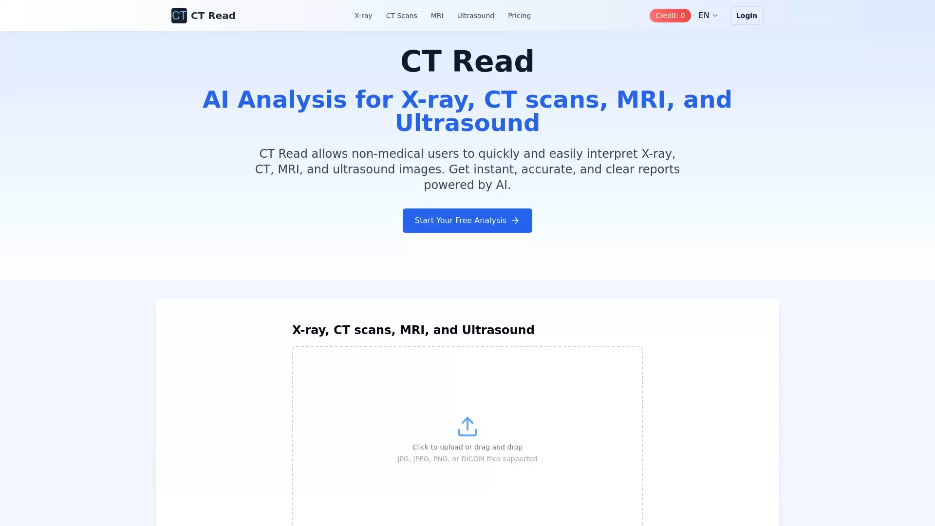 操作流程非常直观。你只需要准备好你的医学影像文件——无论是X光、CT、MRI还是超声图——然后通过CT Read平台上传。平台接受JPG、JPEG、PNG以及专业的DICOM格式。文件上传完毕,剩下的就交给AI了。系统会自动分析图像内容,并在短时间内生成一份详细的解读报告。