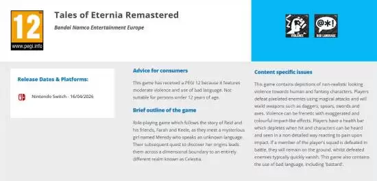 根据知名爆料人Wario64的消息,万代南梦宫旗下的经典JRPG《永恒传说 重制版》已在欧洲PEGI分级机构获得评级,信息显示其登陆平台为任天堂Switch。
