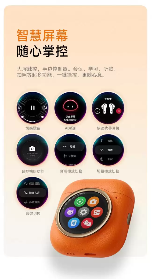 回到产品本身,Lolli5 ANC最大的亮点,无疑是那个“屏”。它的充电盒上集成了一块智能触控屏,这可不是简单的装饰。除了显示时间这类基础功能,你还能直接通过这块屏幕控制音乐播放,甚至把它当成无线快门,远程控制手机拍照。功能集成度相当高。