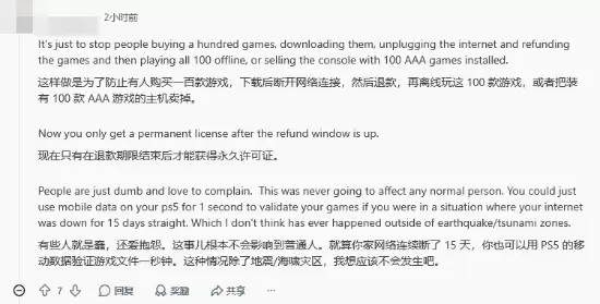 官方的说法,也侧面证实了此前玩家圈子里流传的一个猜测:索尼之所以推出这个机制,是因为发现了一个系统漏洞。这个漏洞能让部分玩家在成功申请退款后,依然可以无限期地游玩已经退款的游戏。可以说,新机制很大程度上是为了堵上这个“后门”。