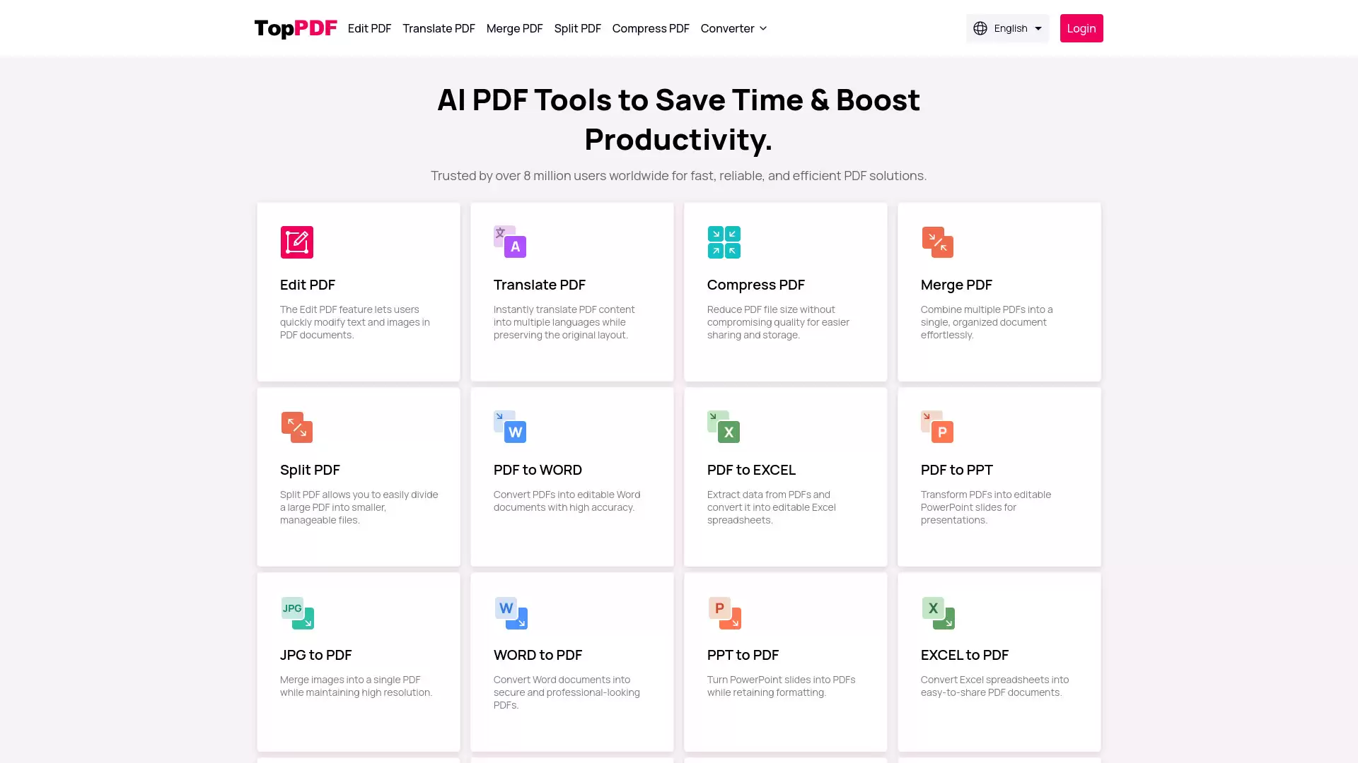简单来说,TopPDF是一个提供快速、可靠且高效的AI驱动PDF工具平台。它凭什么吸引了全球超过800万用户的信赖?关键在于其无缝衔接的工作流程,能帮你轻松应对编辑、翻译、压缩和转换PDF文档等一系列任务。从基础的PDF编辑、合并拆分,到与Word、Excel、PPT、JPG等多种格式的互转,甚至还包括签名、语法检查等贴心功能,它基本上把你能想到的PDF相关操作都整合在了一个地方。