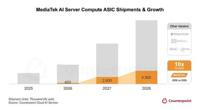 Counterpoint:预计到2028年联发科可占据约26%的全球AI服务器运算ASIC出货量