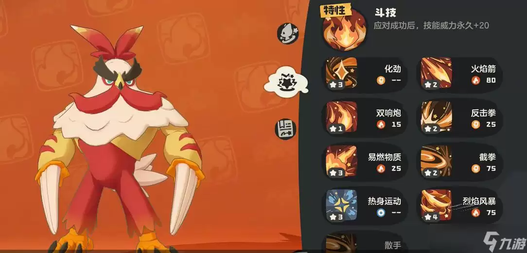 这套组合可谓万金油。炎爆拳作为稳定的火系输出,附带概率灼烧效果,是清理群怪的主力。折翼拳则专门针对飞行系,能打出2倍克制的致命伤害,非常适合收割残局。强健体魄这个技能价值很高,它能同时提升物攻和物防,既增强了站桩对撸的资本,也变相提高了输出。火焰冲锋作为先手技能,无论是抢夺出手节奏、压制对方血线,还是追击意图逃跑的敌人,都非常好用。