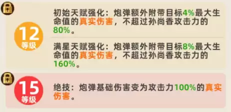 而满星天赋的进一步强化,会将这个比例推至目标8%最大生命值,伤害上限更是高达攻击力的160%。最后,绝技的蜕变发生在15级:此时孙尚香发射的炮弹,基础伤害将变为100%攻击力的真实伤害。这个百分比本身就非常可观,并且其造成的真实伤害会随着等级提升、升星等养成方式不断叠加,后期输出能力极为惊人。