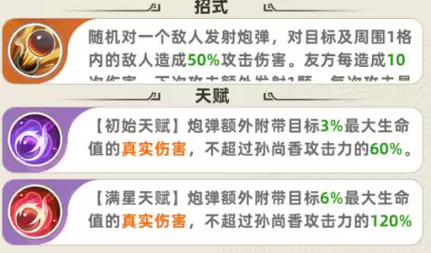 试想一下,在与高攻速射手队友搭配时,频繁的触发能让孙尚香在短时间内倾泻大量火力。每一次攻击,最多可额外发射5颗炮弹,每颗都附带50%的攻击伤害。而她的天赋“穿甲弹”则让这些炮弹威力倍增——额外附带目标13%最大生命值的真实伤害(该伤害不超过孙尚香攻击力的60%)。千万别小看这个百分比,在实战中,它带来的额外破防效果堪称恐怖。