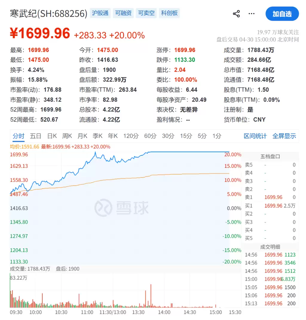 2026年第一季度,寒武纪实现营收28.85亿元,同比增长159.56%,环比增长52.67%;归母净利润10.13亿元,同比增长185.04%,环比增长122.89%;扣非归母净利润9.34亿元,同比增长238.56%,均大幅超出市场预期。受业绩提振,寒武纪30日午后触及20cm涨停,股价逼近1700元,重夺A股“股王”地位,同时带动科创50指数大涨逾5%。