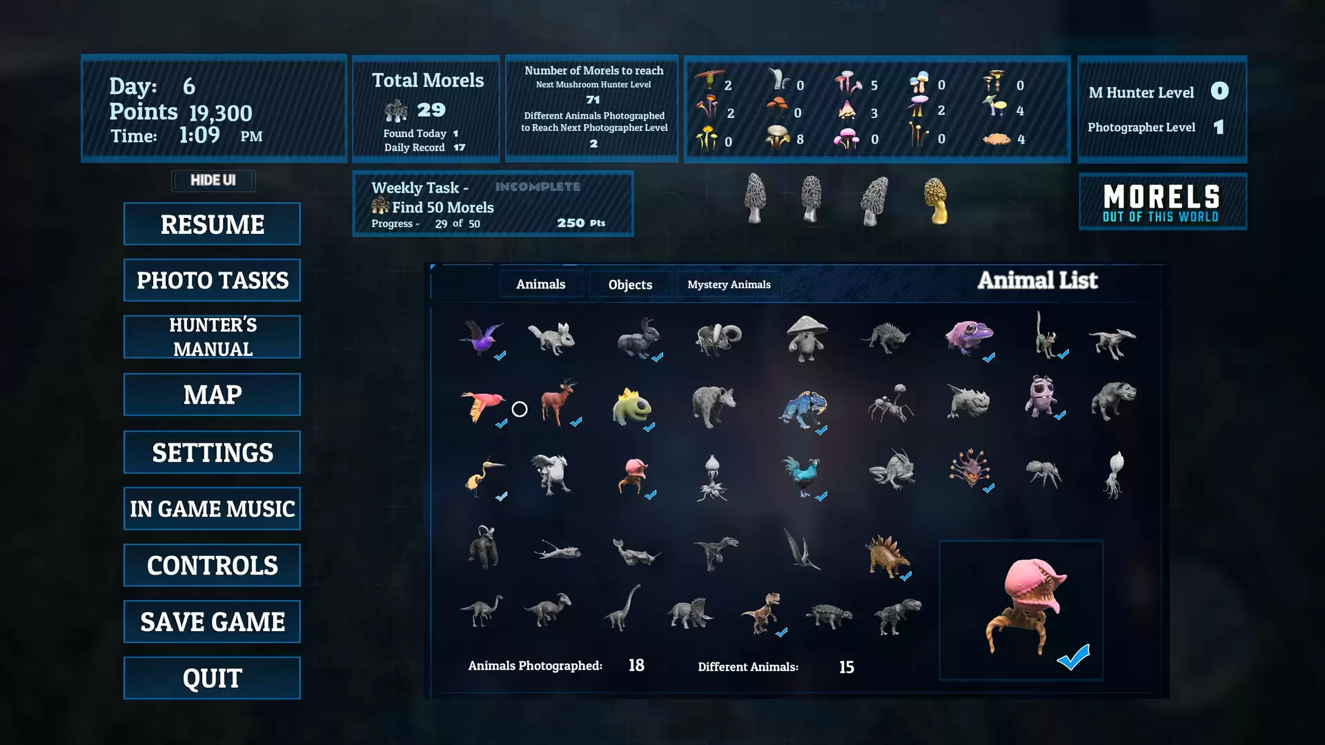 《羊肚菌:外星探索》是一款设定独特的模拟游戏。它将舞台搬到了外星世界,你的核心任务有两项:采集形态各异的蘑菇,以及拍摄那些光怪陆离的野生动物。游戏进程围绕着收集、发现与完成任务展开——通过搜集各类蘑菇、捕捉外星生物的精彩瞬间,并完成每周刷新的挑战,你可以不断提升自己作为“采集者”和“摄影师”的等级。换句话说,这不仅仅是一次采集,更是一场关于外星生态的沉浸式记录之旅。