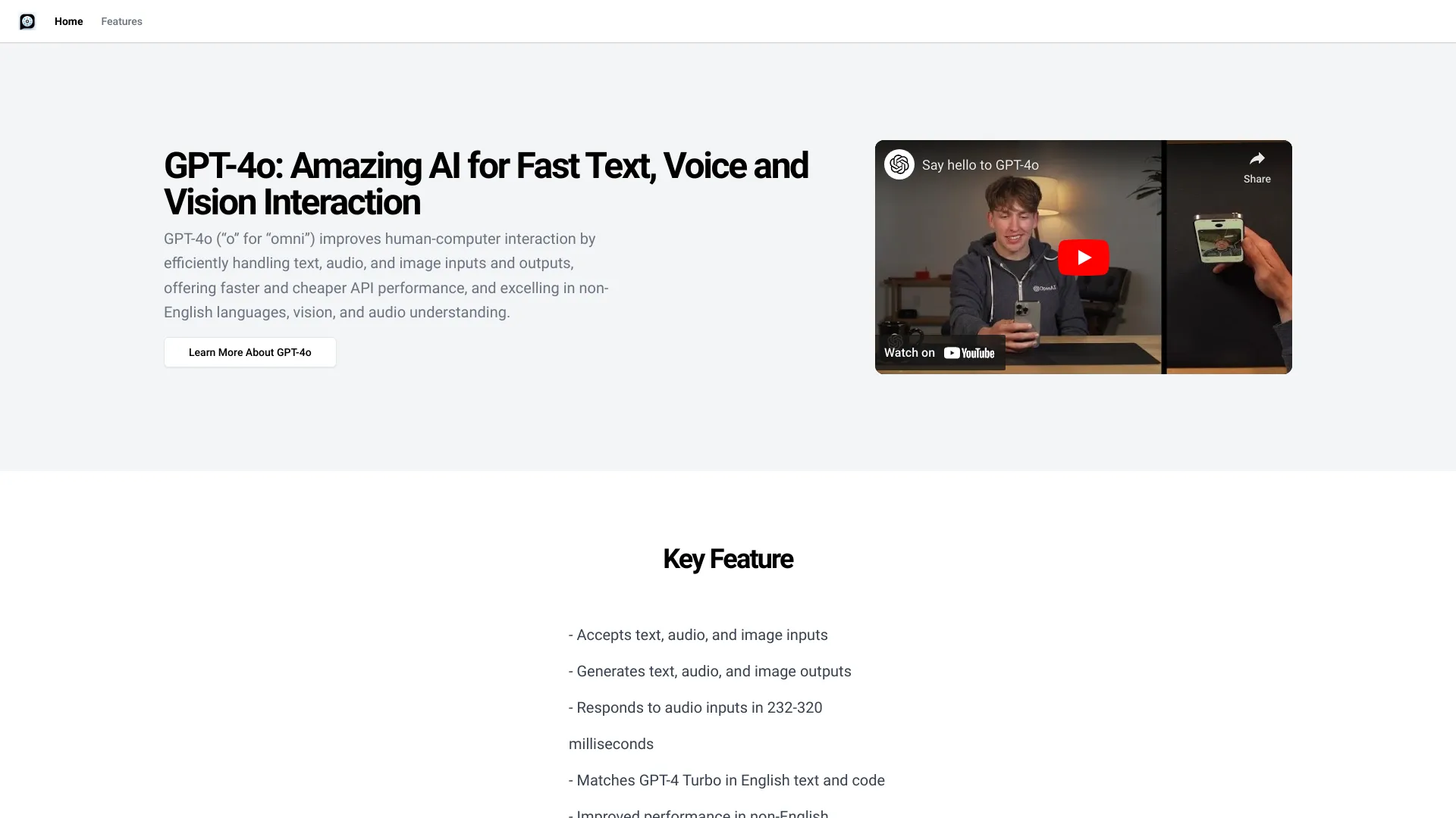使用起来没有任何门槛。用户只需访问该网站,便能自动浏览其精心组织的内容。首页的最新文章能帮你紧跟发展脉搏,详细的功能描述部分让你透彻理解技术内核,而那些视频展示则直观地揭示了GPT-4o在实际互动中的强大能力。这个平台本质上是一个完全开放的信息资源库,对所有关心GPT-4o进展与应用前景的人敞开大门。