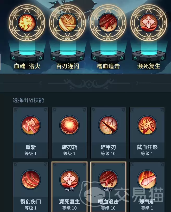 推荐携带的四技能组合为:血魂浴火、嗜血追击、连闪、复生