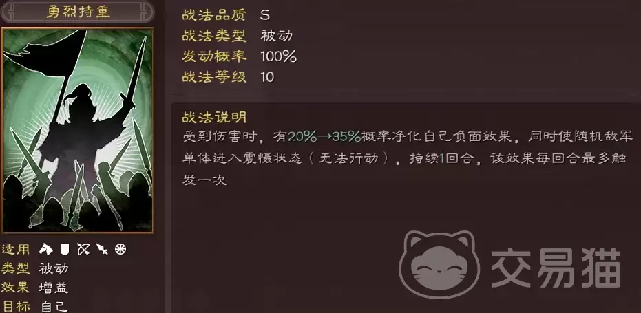 太史慈的战法可以调整为“折冲御侮”和“当锋摧决”。折冲在保护主将的同时,自身生存也得到增强;而当锋摧决的“伪报”效果,堪称被动类和指挥类战法的克星。兵书选用“蛮勇非勇”、“武略”、“胜战”,继续走全武力加点的路线。