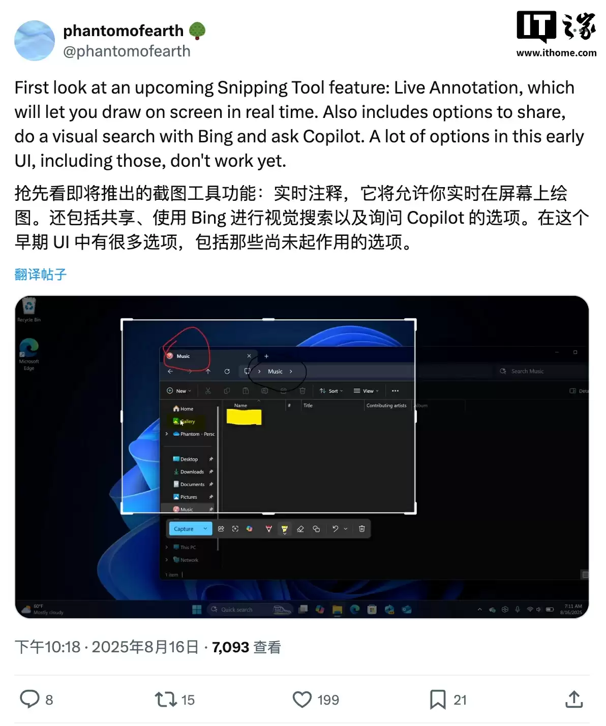 8 月 18 日消息,长期发掘 Windows 系统功能的博主 @phantomofearth 于 16 日在 X 上公布了自己的最新发现,Windows 11 的截图工具将新增“实时注释(Liv